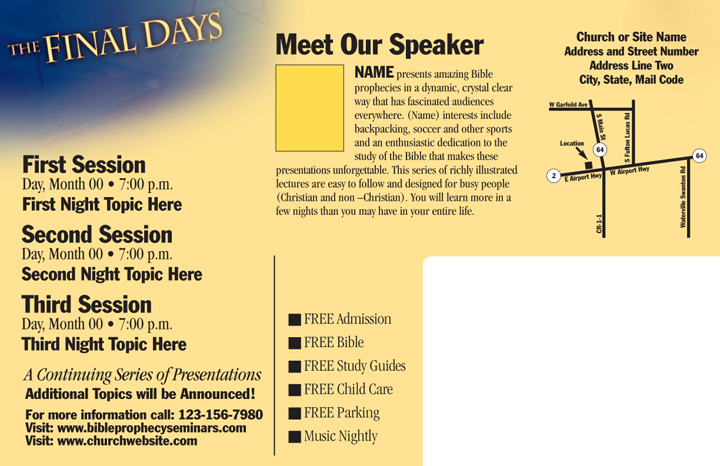 These full-color, oversized postcards are an easy and effective way to get the word out! Featuring beautiful prophecy designs and customized with your meeting information, postcards from Hamblin’s HOPE™ are a great reminder tool to supplement your handbill mailing or send a powerful message on their own.